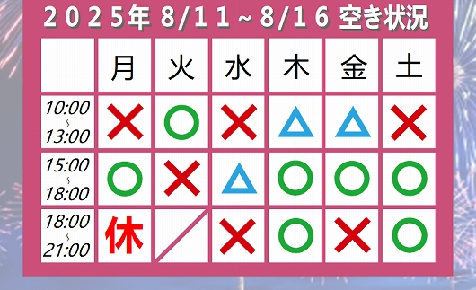 今週の空き状況 2025 8/11 Uncategorized 2025年8月11日 2025年 8/11(月)~8/16(土)までの予約の空き状況です。 Uncategorized よかったらシェアしてね! URLをコピーしました! URLをコピーしました!