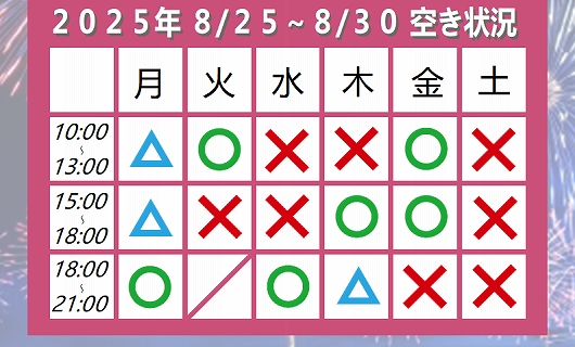 今週の空き状況 2025 8/25 Uncategorized 2025年8月25日 2025年 8/25(月)~8/30(土)までの予約の空き状況です。 Uncategorized よかったらシェアしてね! URLをコピーしました! URLをコピーしました!