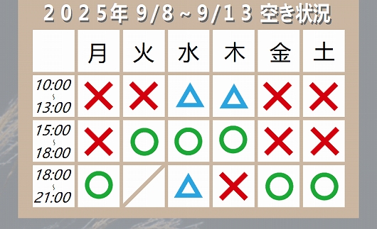 今週の空き状況 2025 9/08 Uncategorized 2025年9月8日 2025年 9/8(月)~9/13(土)までの予約の空き状況です。 Uncategorized よかったらシェアしてね! URLをコピーしました! URLをコピーしました!