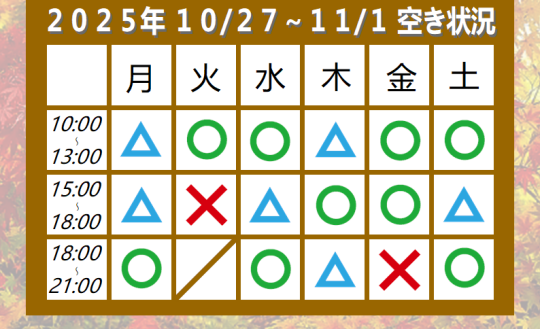 今週の空き状況 2025 10/27 Uncategorized 2025年10月27日 2025年 10/27(月)~11/1(土)までの予約の空き状況です。 Uncategorized よかったらシェアしてね! URLをコピーしました! URLをコピーしました!