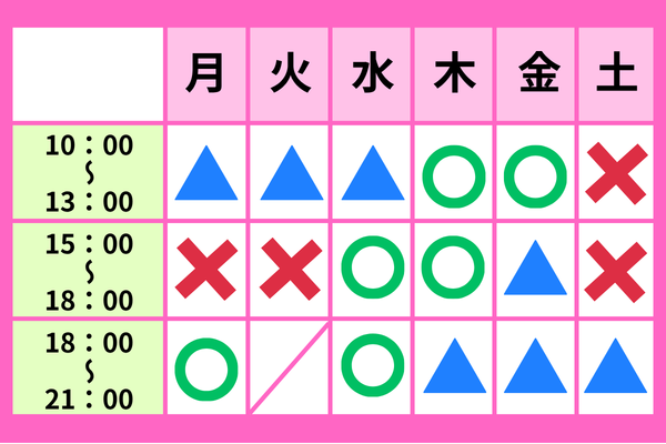 今週の空き状況 2026 4/06 Uncategorized 2026年4月6日 2026年 4/6(月)~4/11(土)までの予約の空き状況です。 Uncategorized よかったらシェアしてね! URLをコピーしました! URLをコピーしました!